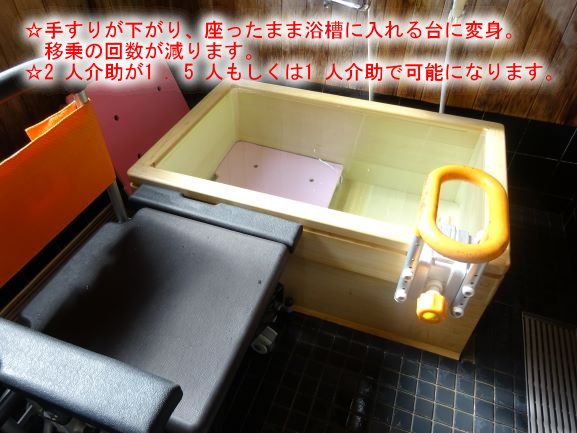 さらに座面の高さが浴槽の縁の高さと一緒で、なおかつ肘掛けが下がるので、身体を洗った後は浴槽に横付けして、歩くことなく座って浴槽に出入りが可能な浴槽台に早変わりします。