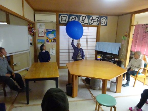 大きい風船だと手先だけの運動でなく、足を踏ん張り身体全体を使うので、見た目よりもかなりの全身運動になる