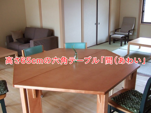 私たちのデイサービスは38pの座面の椅子に65cmの高さのテーブルを(一般的には72cm程度)を使っています。