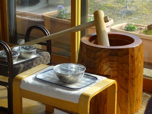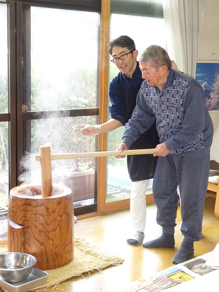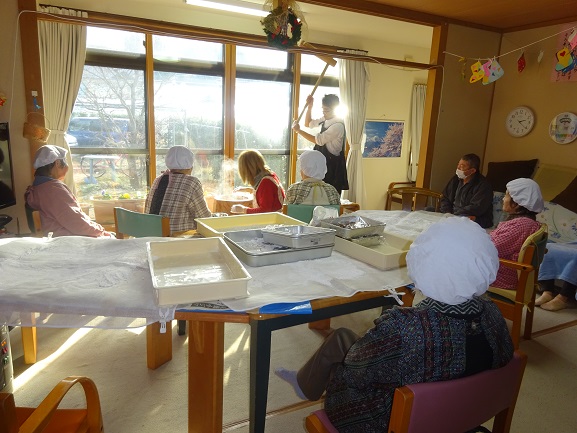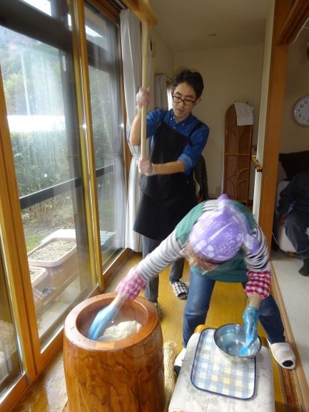 餅つき…『臼と杵で突いた餅をみんなで丸める』