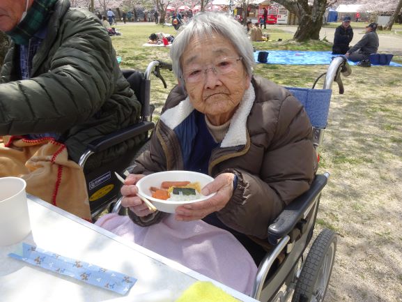 言葉や態度でせかさないのはもちろんのこと、手助けが必要な人への介助も、どうしてもという必要最小限にとどめ、ご自分のペースで食べて頂けるように配慮しています。