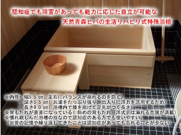 といっも大がかりな機械のお風呂ではありません。認知症や障害のある方が可能な限りご自分の力を使い、また手助けが必要なところは気持ちよく介助を受けながら安全に入浴することが出来るようにと設計された青森ヒバの『生活リハビリ浴槽』です。