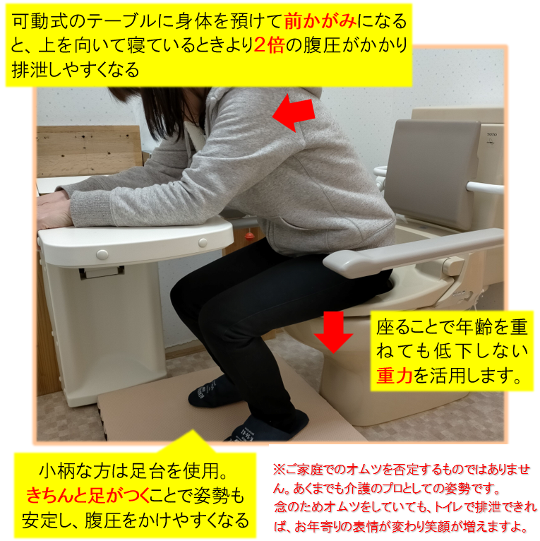 「座る」「足をつく」「前かがみ」という排泄しやすい姿勢をサポートします。