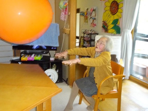 大きい風船だと手先だけの運動でなく、足を踏ん張り身体全体を使うので、見た目よりもかなりの全身運動になる